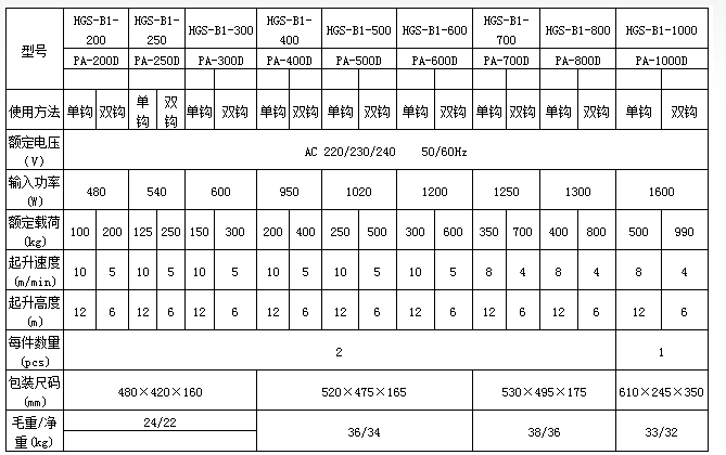 PA500D微型電動葫蘆技術參數表: